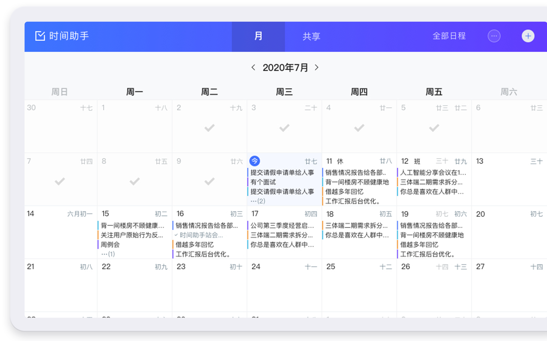 工作助手包含日程、任務協作及個人備忘;日程支持共享,方便管理者了解員工工作安排,項目組成員清楚相互的工作計劃