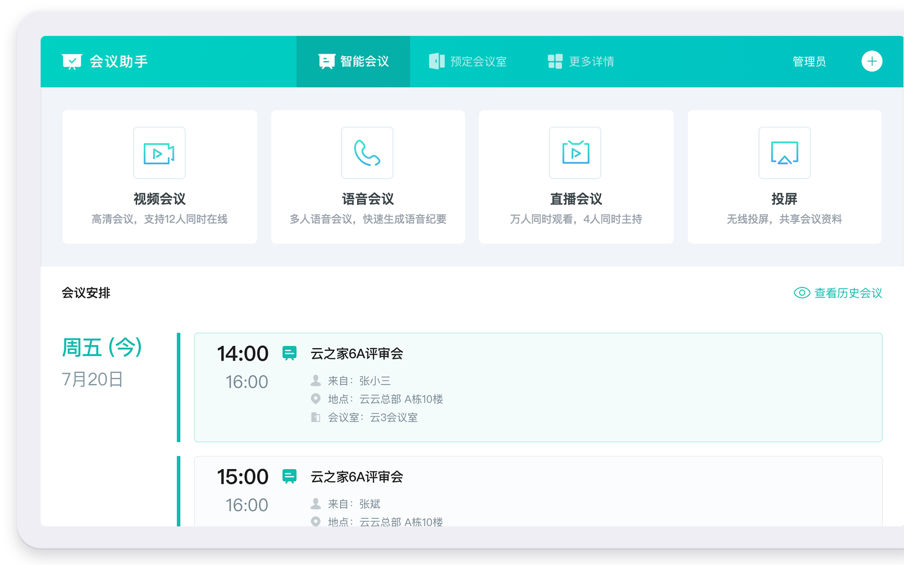 智能會議支持語音會議、直播會議、視頻會議3種形式進行召開,包括會議通知、會議室預訂、會議室審批、會議提醒等基礎功能