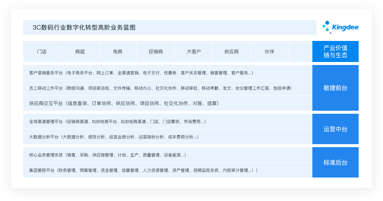 企業可以靈活地定義自己的業務,平臺即業務,全面支撐3C數碼企業內外部價值鏈重構,加快產品、渠道、服務的轉型升級