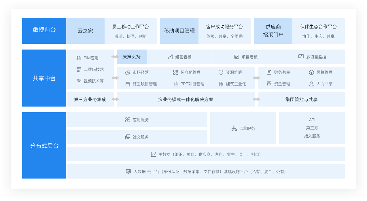 支持建筑企業產業鏈一體化、多元化發展戰略與商業模式的創新,為企業打造了一個多業務模式、產業鏈一體化、共享與生態的企業統一信息化管理平臺
